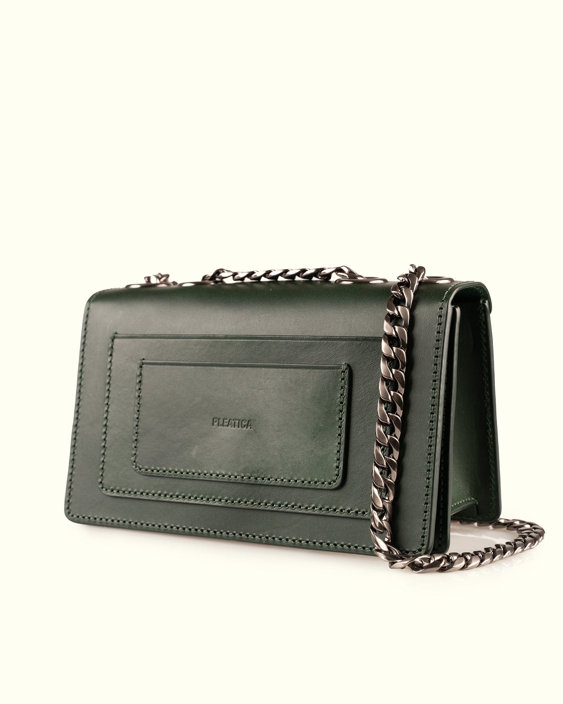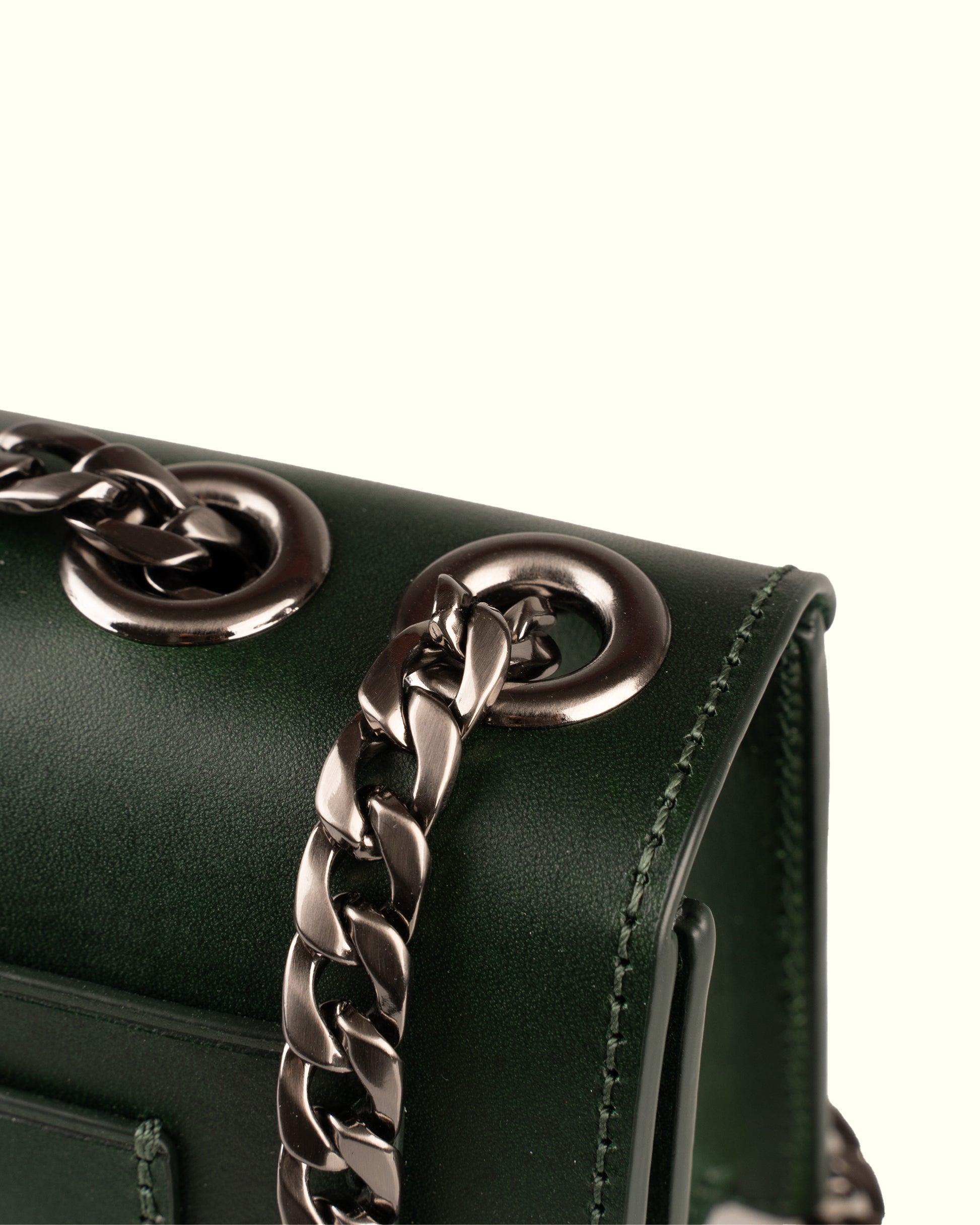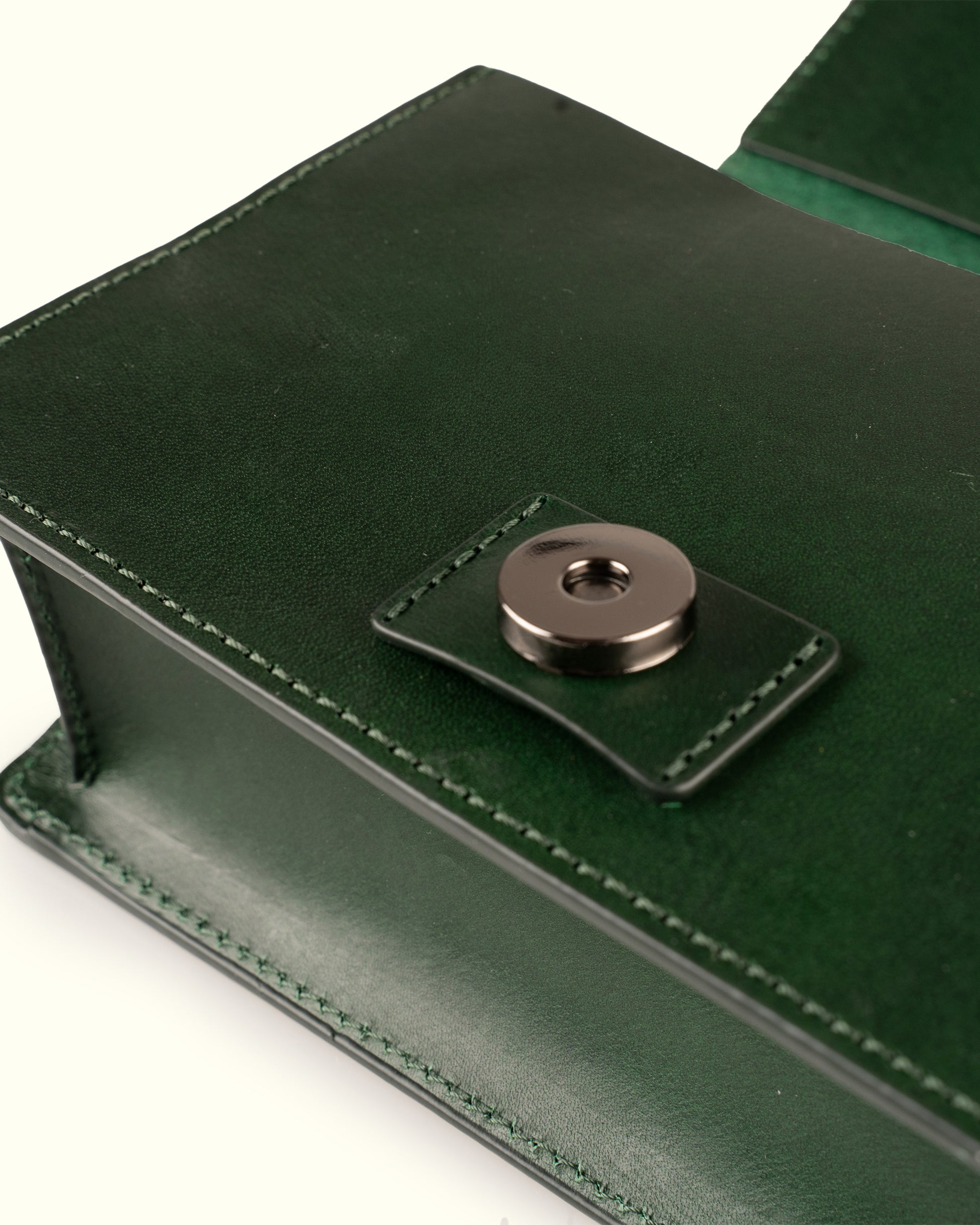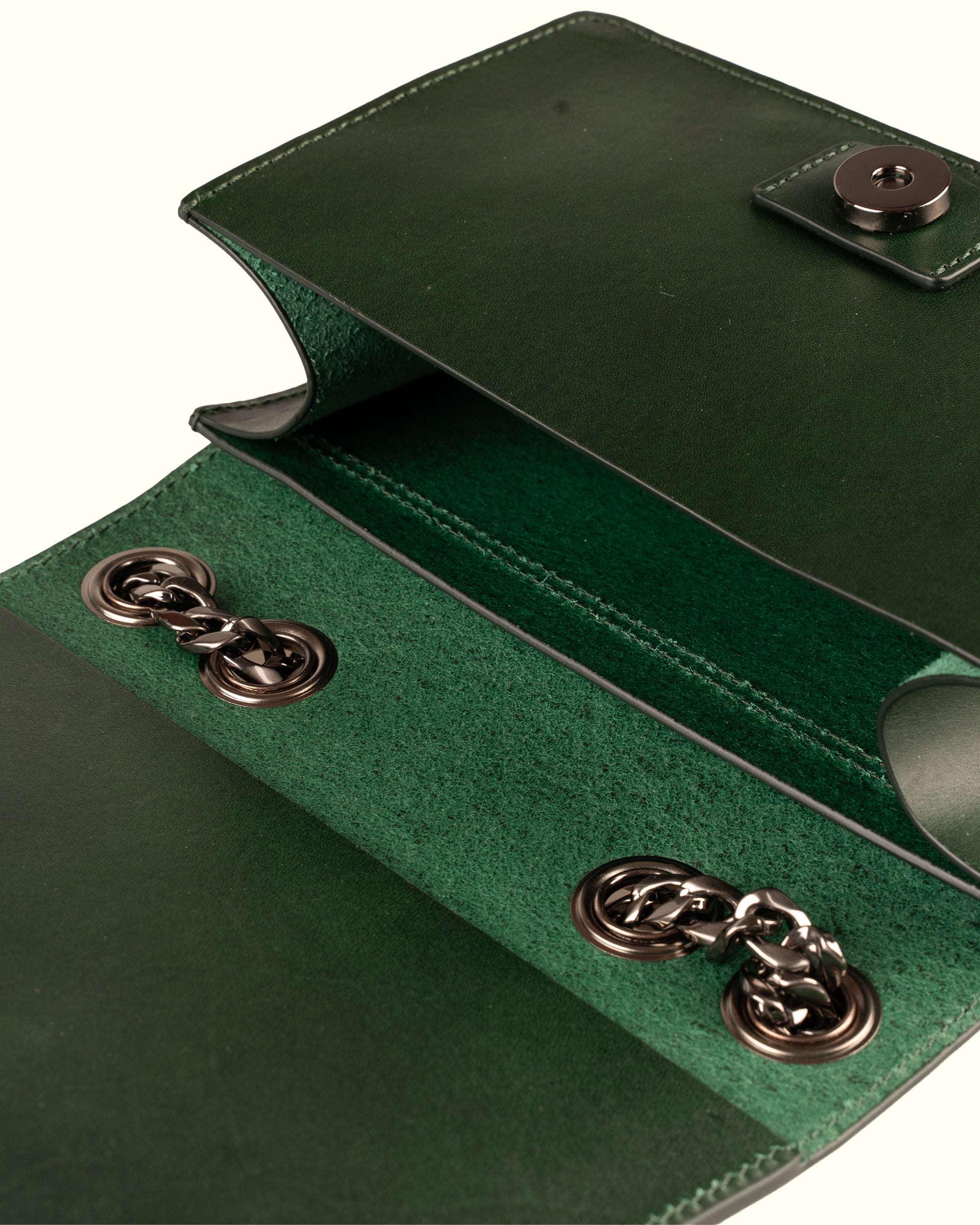 ディープグリーンのレザーにステッチが加わり、まるで森の中で木々の間から差し込む光景を思い起こさせます。緑が調和し、森の静けさとともに温かな活気を感じさせてくれるようです。