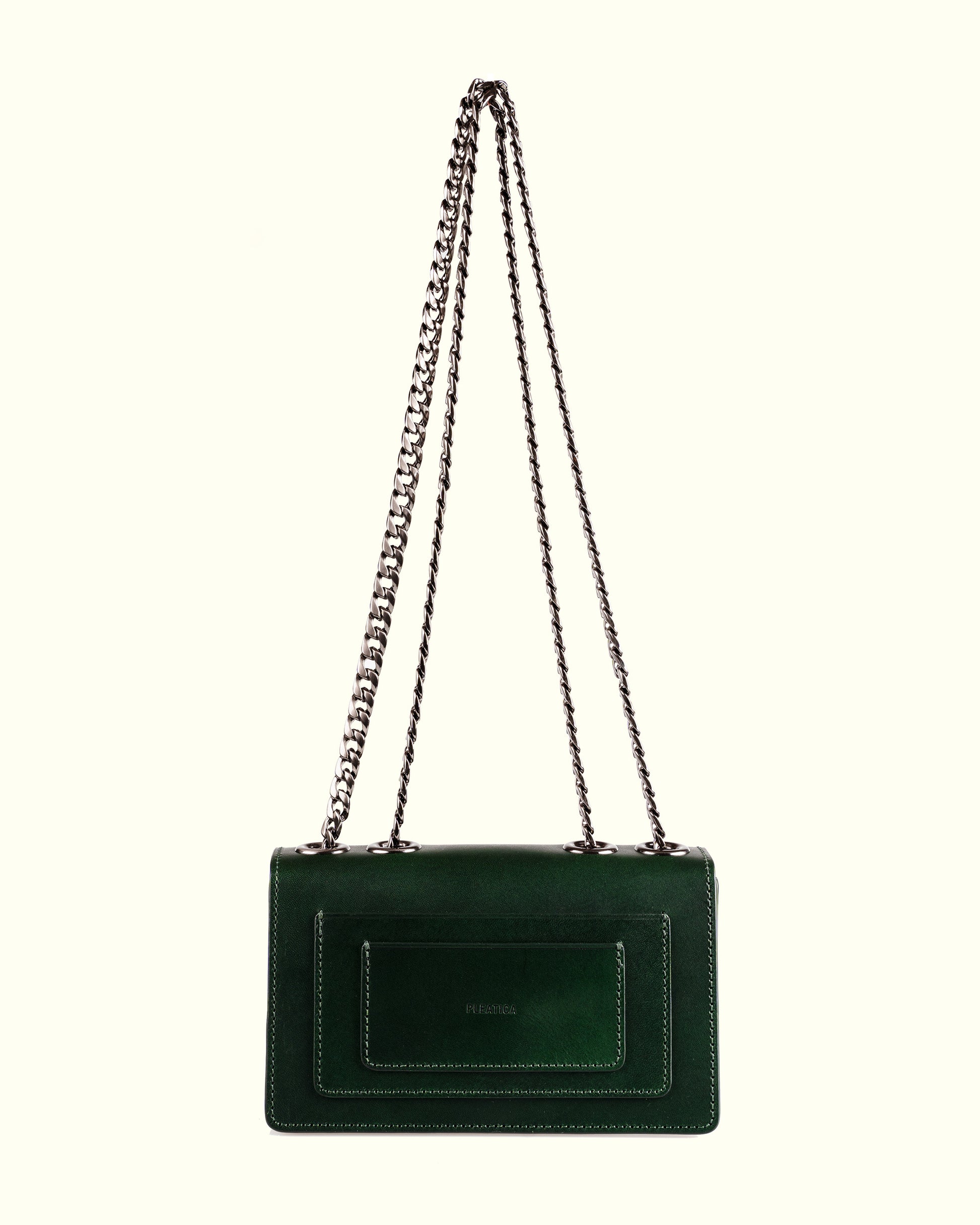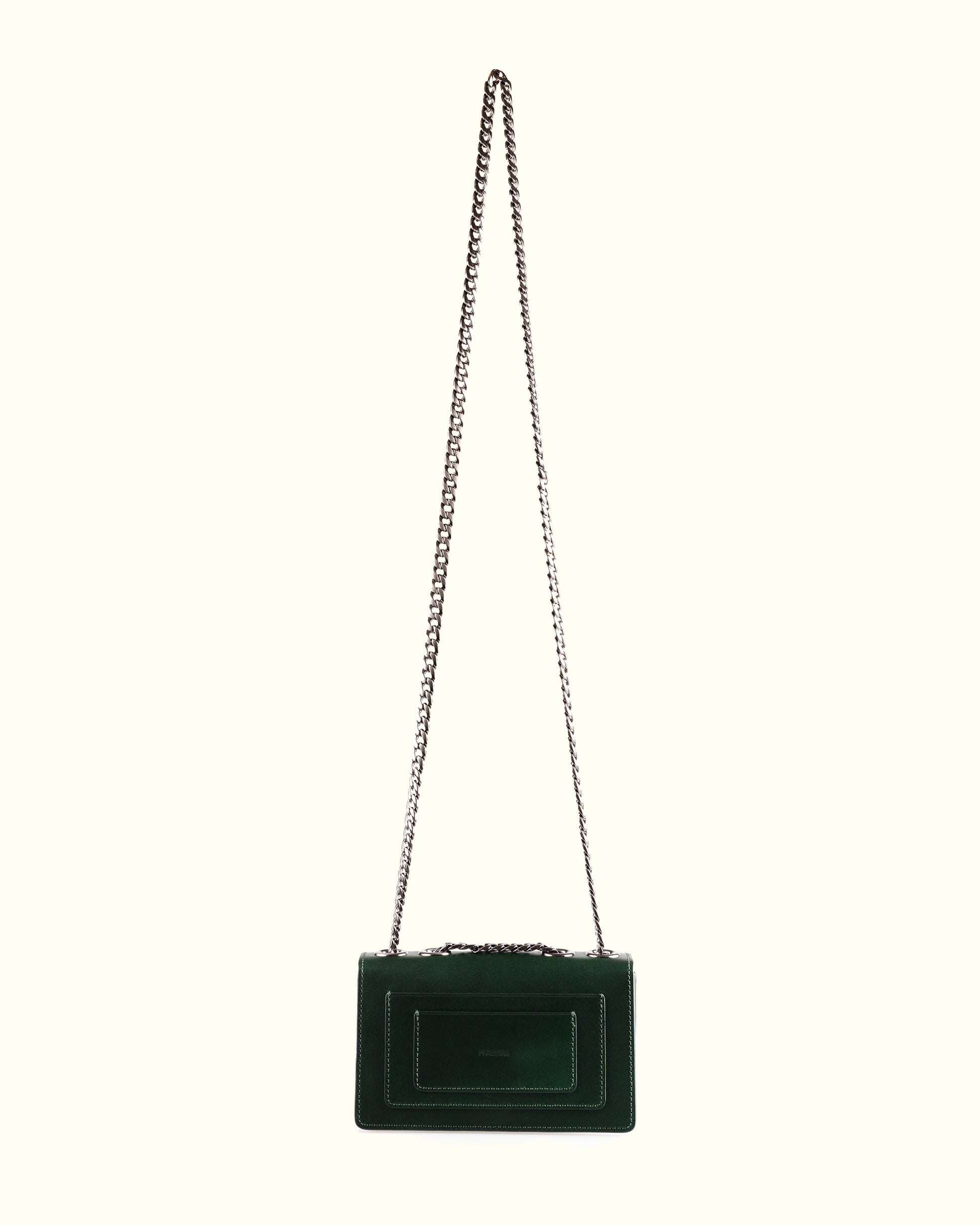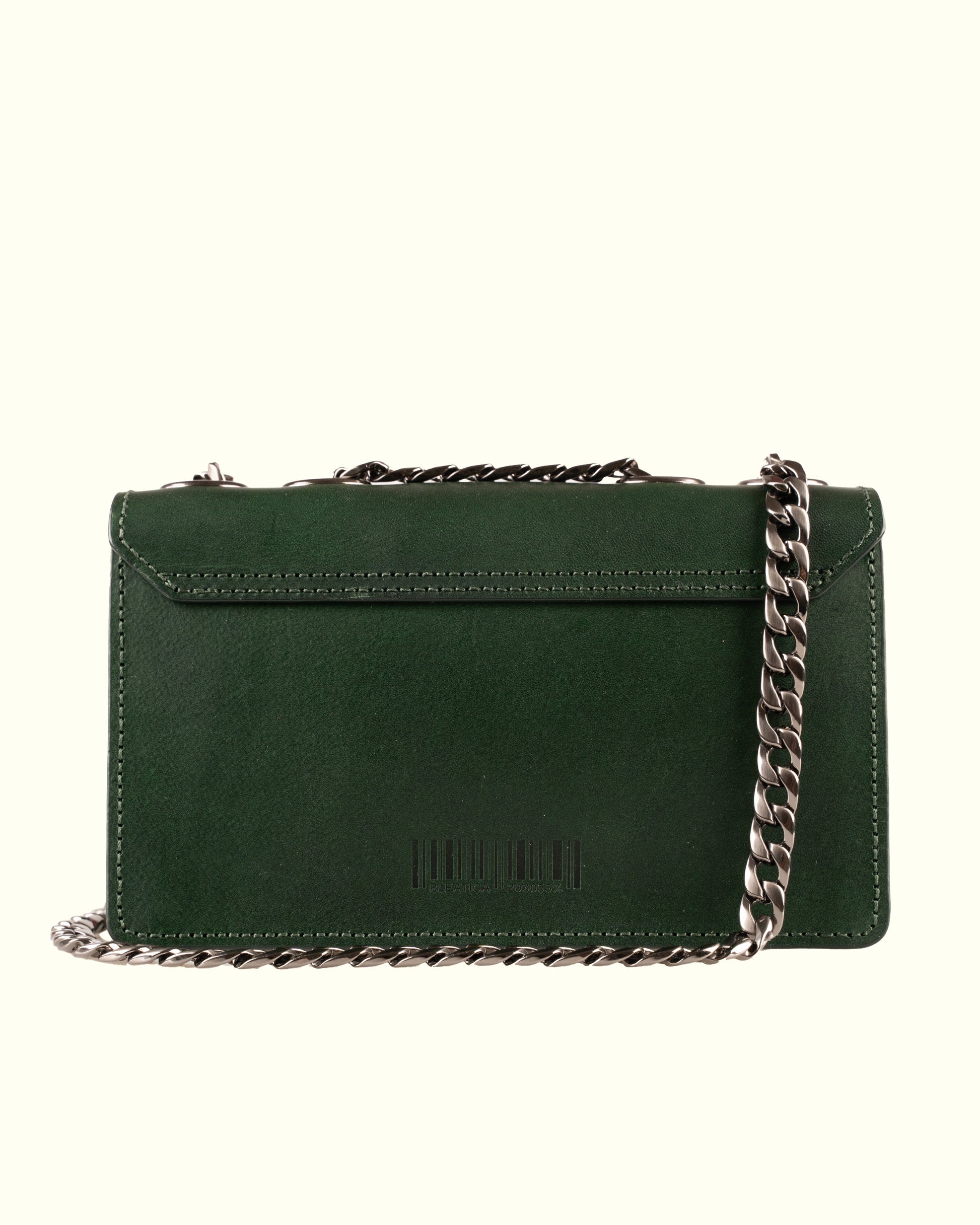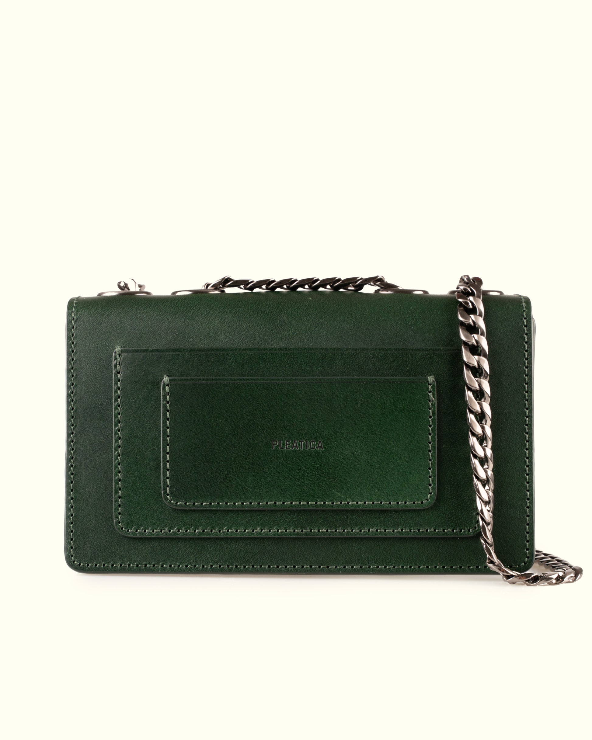 ディープグリーンのレザーにステッチが加わり、まるで森の中で木々の間から差し込む光景を思い起こさせます。緑が調和し、森の静けさとともに温かな活気を感じさせてくれるようです。